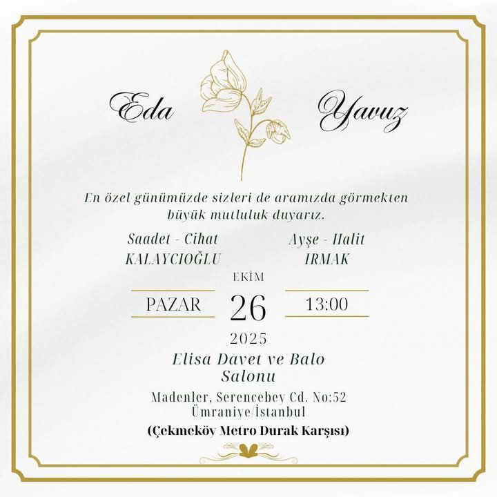 Nişan-Düğün Haberleri Eda-Yavuz Düğünü Post By Turkelli 26 Ekim 2025 Eda Kalaycıoğlu ile Yavuz Irmak Düğünü. 26.10.2025 Oğuz’dan Kalaycıoğlu ailesinden Eda Kalaycıoğlu (Saadet-Cihat kızı) ile Yavuz Irmak (Ayşe-Halit oğlu) Düğünü. 26 Ekim 2025 Mutluluklar dileriz.