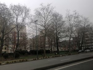 Yol üzerinde yüksek katlı taş binalar. sağlı sollu yükselmekte ,binaların yola bakan kısımlarda , sıralanmış ağaçlar.